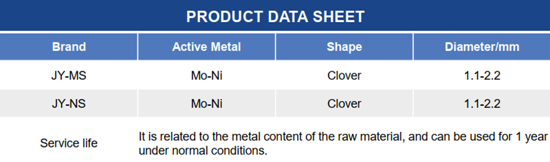 JY-MS and NS  is catalysts for heavy oil hydrodesulfurization and nitrogen removal. It is suitable for the hydrotreating process of heavy oil and other inferior distillate oil, and its main function is to further remove impurity sulfur in raw oil, and appropriately remove nitrogen and carbon residue.